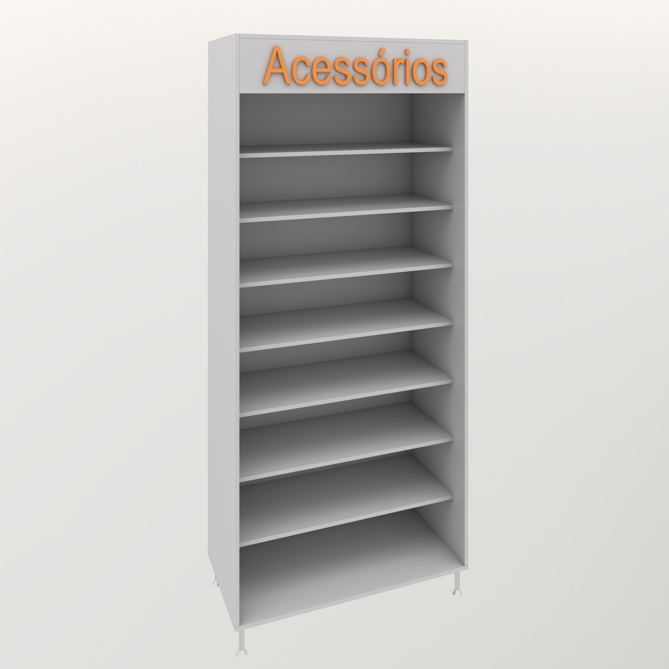 Armário em MDF Cinza Cristal, medindo 90x44x210 cm, com sete prateleiras reguláveis e pés metálicos de 10 cm.