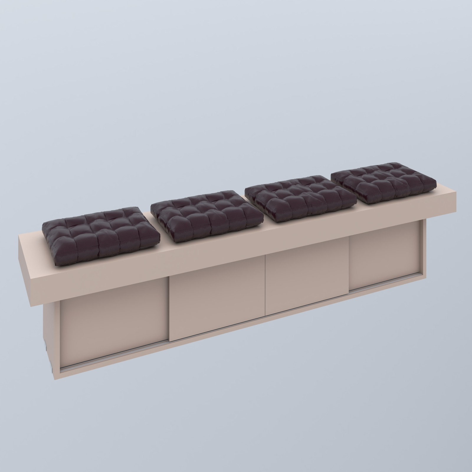 Móvel medindo 2.00 x 0.45m em mdf rosa milkshake, contendo três portas de correr e almofadas na cor padrão Marsala.