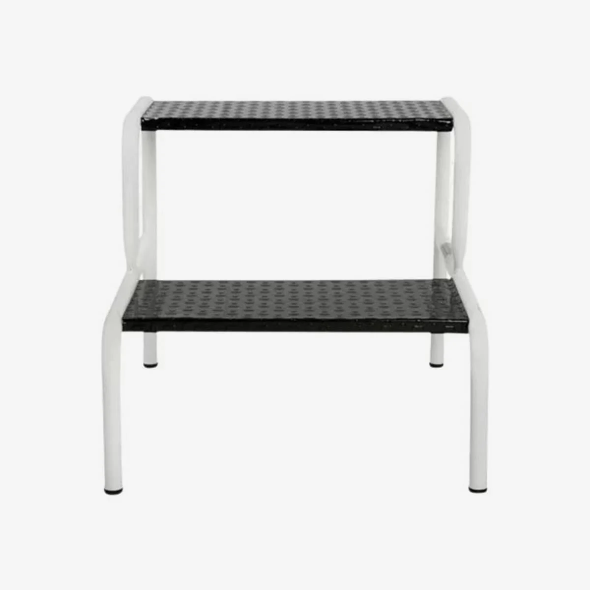 Armação tubular com pintura epóxi reforçada com degraus revestido em material antiderrapante pés com ponteiras em pvc. Dimensões externas aproximadas: Compr. 0,38 cm x Larg. 0,37 cm x Alt. 0,41 cm. Altura do primeiro degrau ao piso 18 cm. Altura do primeiro degrau em relação ao segundo degrau 23 cm.