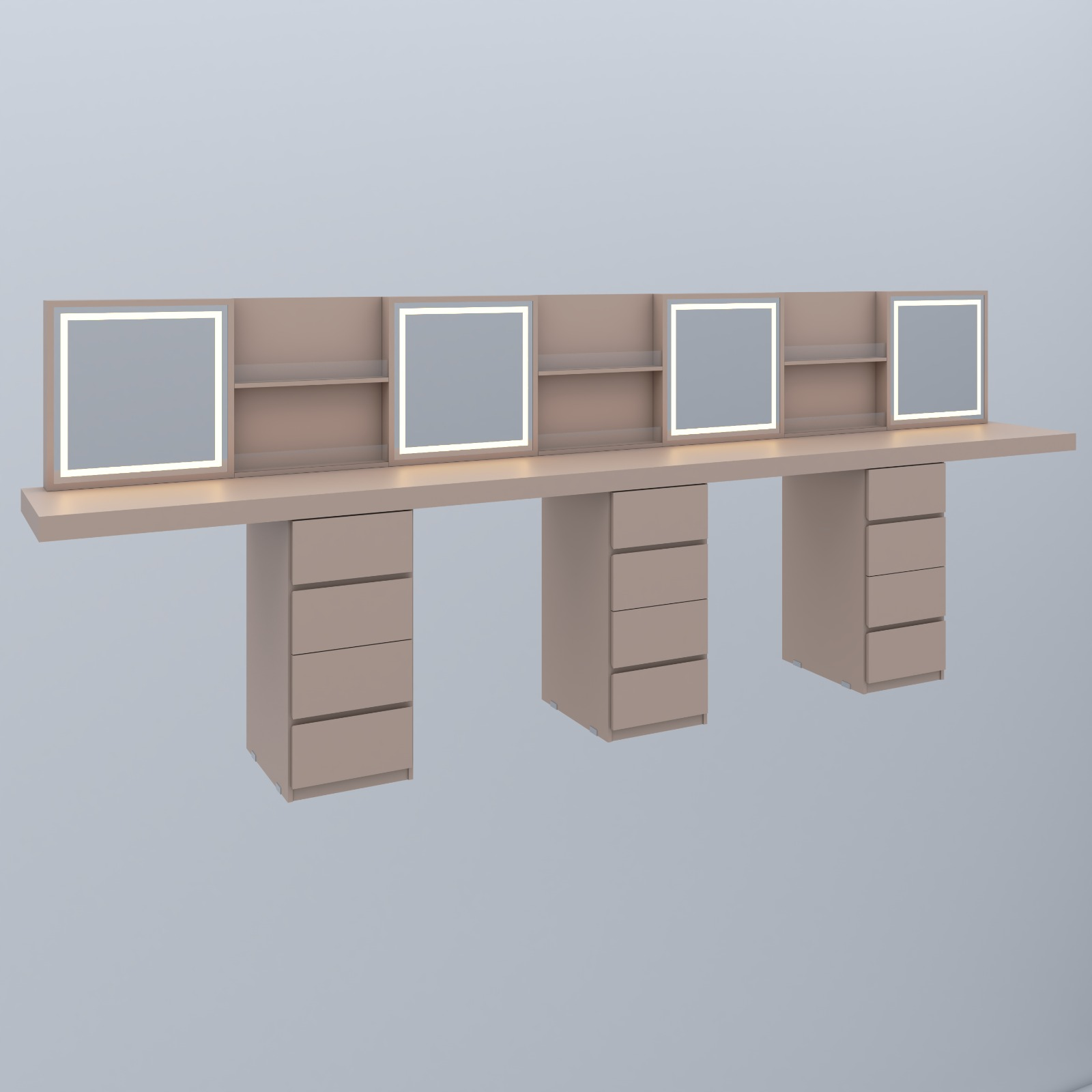 Móvel medindo 3.87 x 1.50m em mdf rosa milkshake, contendo três gaveteiros com quatro gavetas cada puxador cava reta e painel com quatro espelhos prata com iluminação direta.