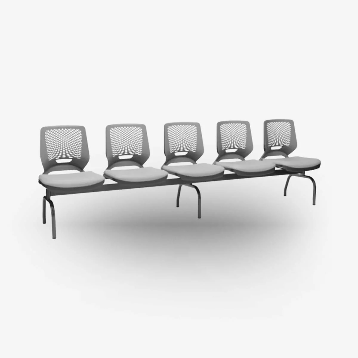 Pés metálicos pretos / travessa preta / sem apoio de braços / assento almofadado facto dunas cinza / encosto em polipropileno cor cinza.