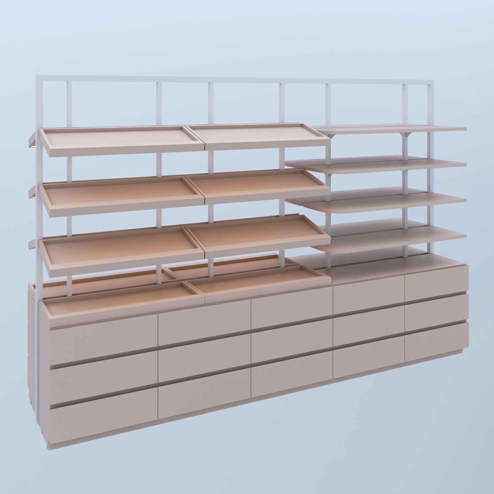 Móvel em mdf rosa milkshake, medindo 2.50 x 1.70m com gavetas puxador cava reta, prateleiras e bandeijas fixas, estrutura em metalon 30 x 30 com pintura branca.