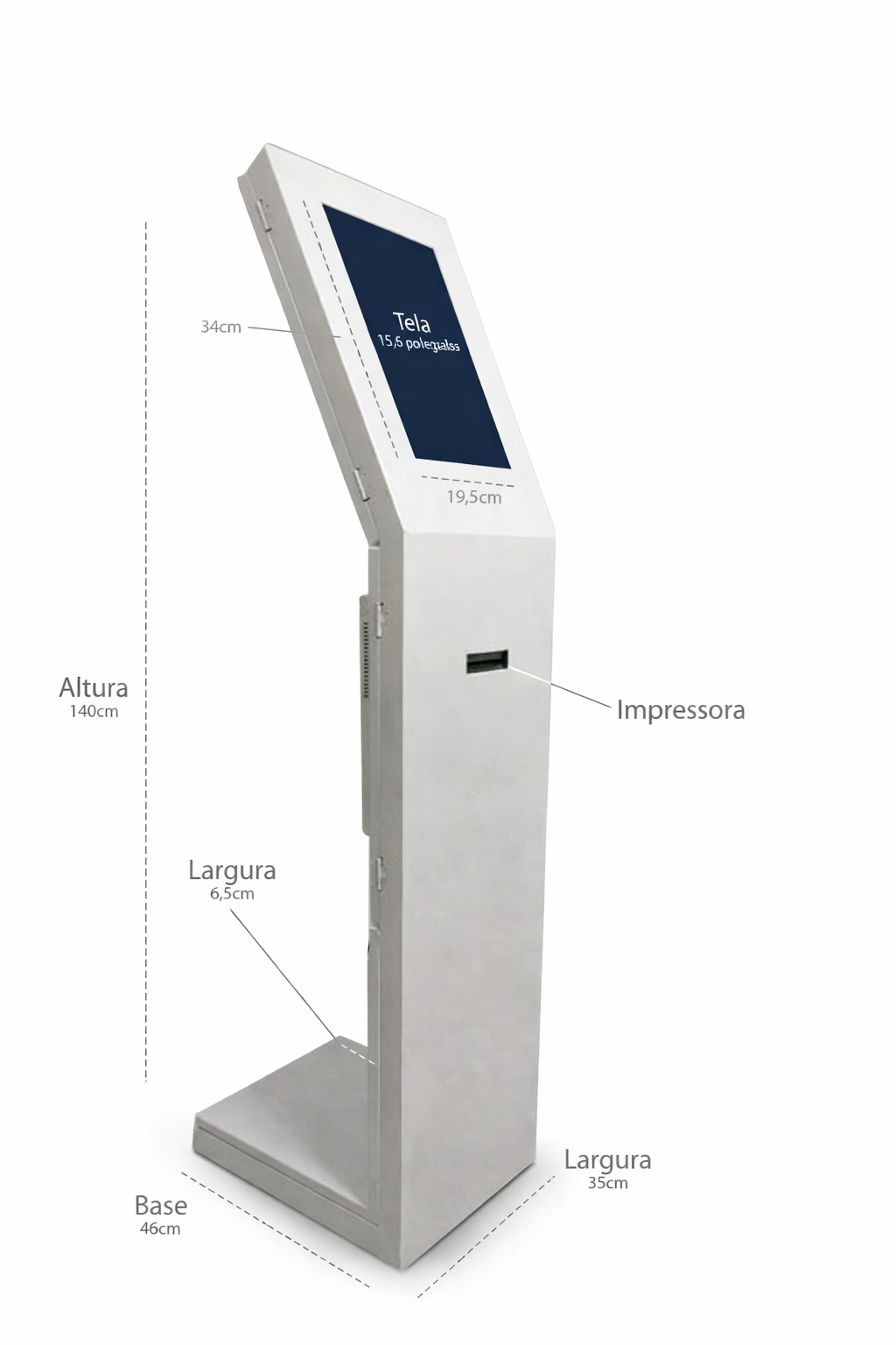 Estrutura em aço com pintura eletrostática, monitor de 15.6 polegadas touch, incluso impressora térmica de rede.